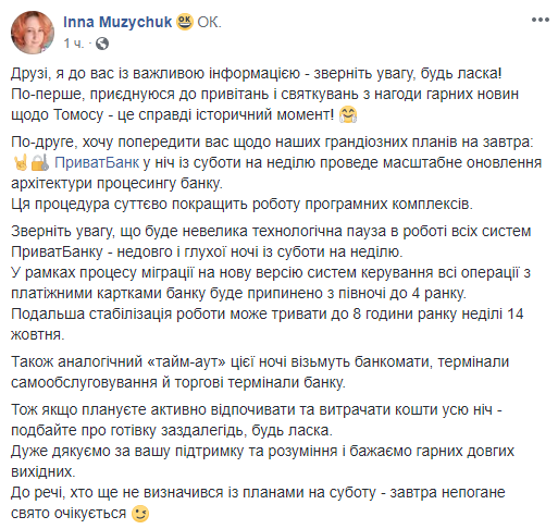 «ПриватБанк в ночь с субботы (13 октября. – Ред.) на воскресенье (14 октября. – Ред.) проведет масштабное обновление архитектуры процессинга банка.